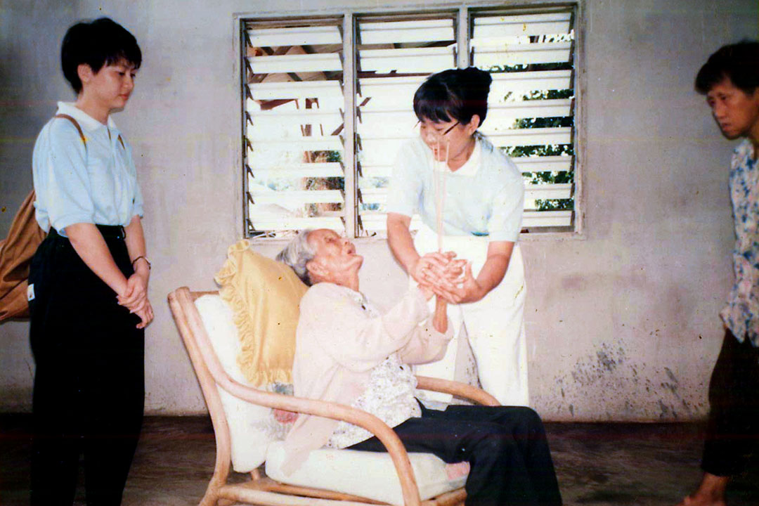 此外,那个年代的志工没有太多训练或医疗背景,去照顾需要关怀的慈善个案。她印象最深的是一位王奶奶,独居、脚溃烂严重,慈济协助安置到老人院并持续探访关怀。每周,她与志工们前往老人院帮她洗澡、清理伤口。