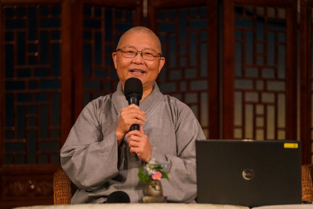 玮师父自嘲在出家前是“不动三宝”,最排斥的是很脏的洗手间。他分享第一次在精舍轮值打扫净房,从一开始很抗拒,到最后伸手进马桶洗刷;从内心交战,提起勇气,到弯腰去刷洗马桶的过程,他逗趣地诉说着从高高在上到放下我执的心路历程。他感慨过去优渥的生活,让他忘记洗手间是谁打扫的,草是谁拔的,菜是谁煮的。在精舍里生活让他一直培养感恩心,从做的当中去感恩每一位愿意放下身段、去做平日我们不愿意做的事情来成就大家的人。