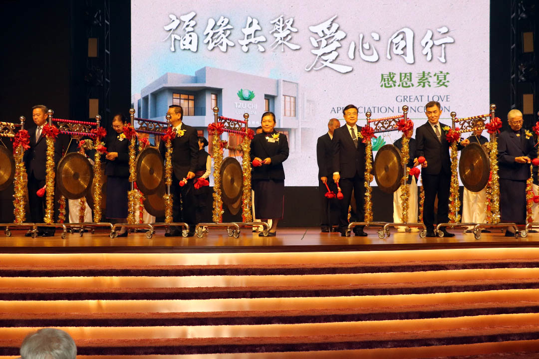 素宴节目最感人的时刻,是擂鼓鸣锣仪式。志工邀请赞助慈济乌鲁地南新会所建设基金的热心人士上台打鼓敲锣。锣鼓喧天的声响,萦绕整个会场,瞬间将现场氛围推向最高点。