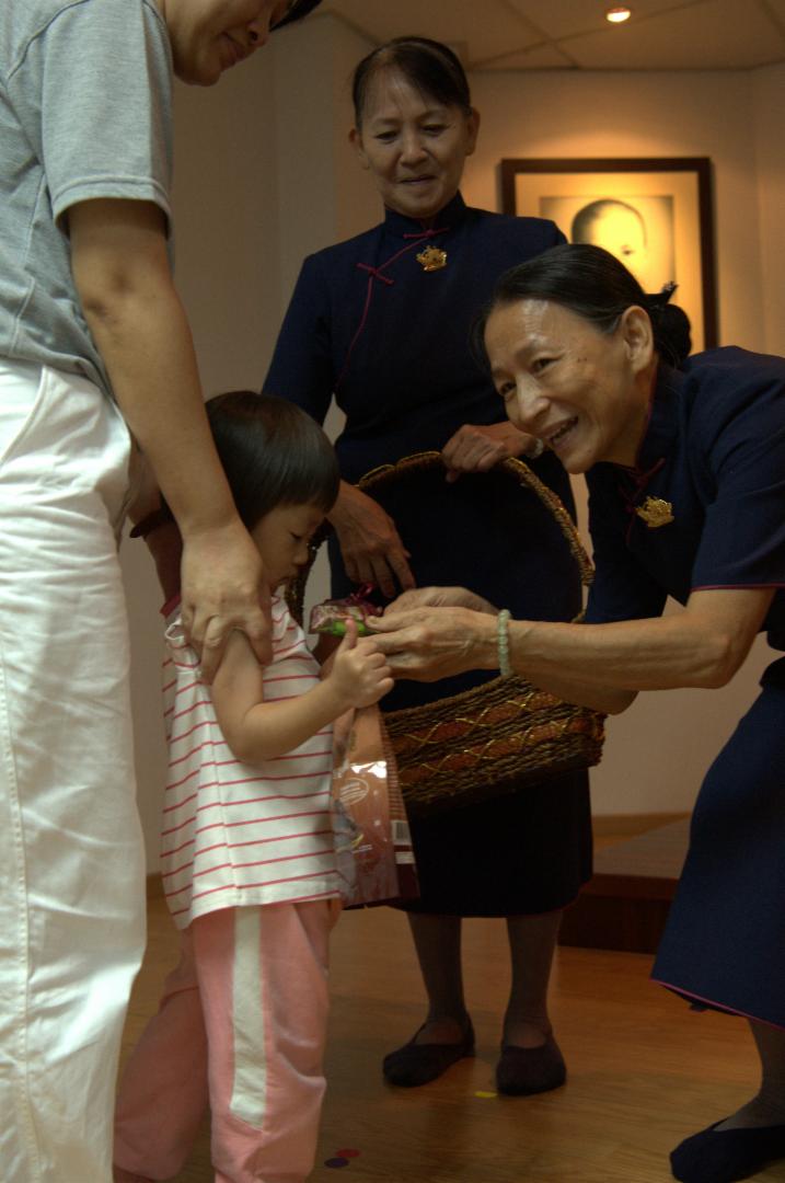 李金勤弯下身分发福慧袋给小孩,感恩上人开创慈济世界,以环保为修行法门,守护大地,也洗涤自心。 【摄影:赵彩欣】