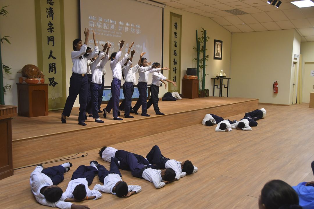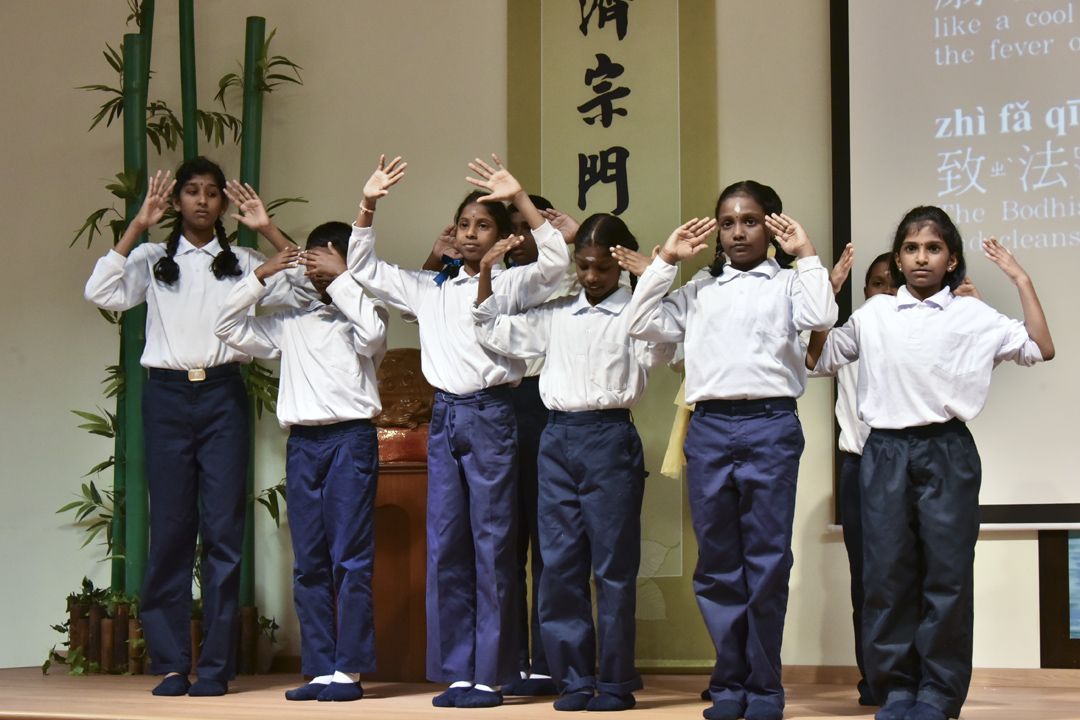 这场特别的岁末祝福中,也有这么一群小至六岁,大至十五岁的印裔课辅班学生,随着音乐的播放,以庄严不失道气的模样,演绎《佛陀渡河》的佛典故事,二十五位黑珍珠小菩萨透过肢体语言传递佛法,让与会者皆沉浸在满满的法喜中。