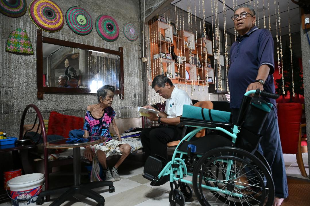 应村民所需,医师在阿昌屋长(右)的陪伴下,到村民住家为行动不便的乡亲看诊,同时送上一台轮椅,以帮助老人家行动及方便家属。【摄影者:黄贤贤】