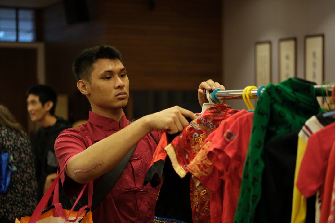 多年来,志工持续提供清血药物补助与每月生活费,并定期家访,陪伴孩子们面对提早踏入社会的现实。其中,二儿子康健友最为懂事,每年都会陪同父亲出席新春发放。今年,他身穿红衣,推着呼吸功能不佳的父亲坐上轮椅,随着社区照顾户一同步入会场。来到惜福区时,他耐心地为父亲与家人添置衣物与生活用品,每一样都先与父亲商量,细心而周到,也为侄女挑选了漂亮的小裙子。能在佳节出远门、享用素食围炉,康演望的脸上满是欢喜。