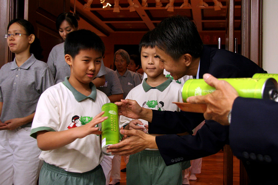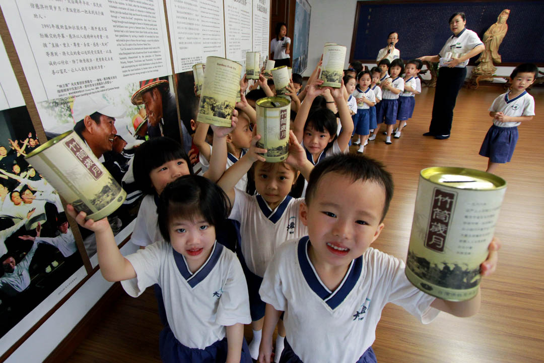 “一人一善,远离灾难;小钱也能行大善……”2009年,马六甲大爱幼儿园推广“竹筒岁月传大爱”运动,孩子们用回收物制成爱心扑满,提起勇气向身边的亲朋戚友募爱心,也认真地把自己的零钱往里面塞,再将累积的善款换成物资,转送至特殊儿及残障儿童中心,他们腼腆笑说:“我把零用钱存在竹筒里,觉得能帮助别人很幸福。”
