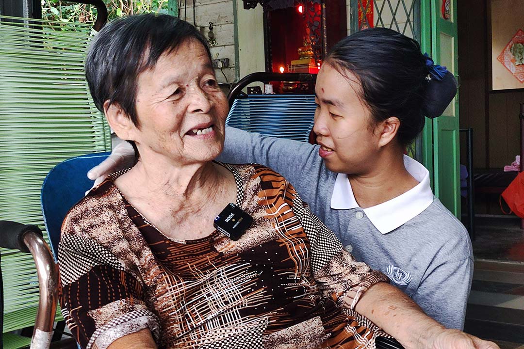 她嘴里不断表达:“很感恩,看到你们来,我们就开心了。”朴实的话语,道出长者内心最真切的感受。她看向郑绣媖表示:“这位志工很好,我们都很喜欢她,开心可以看到她。”一句简单的话,传达了多年不间断关怀在长者心中累积的深厚信任与依赖。