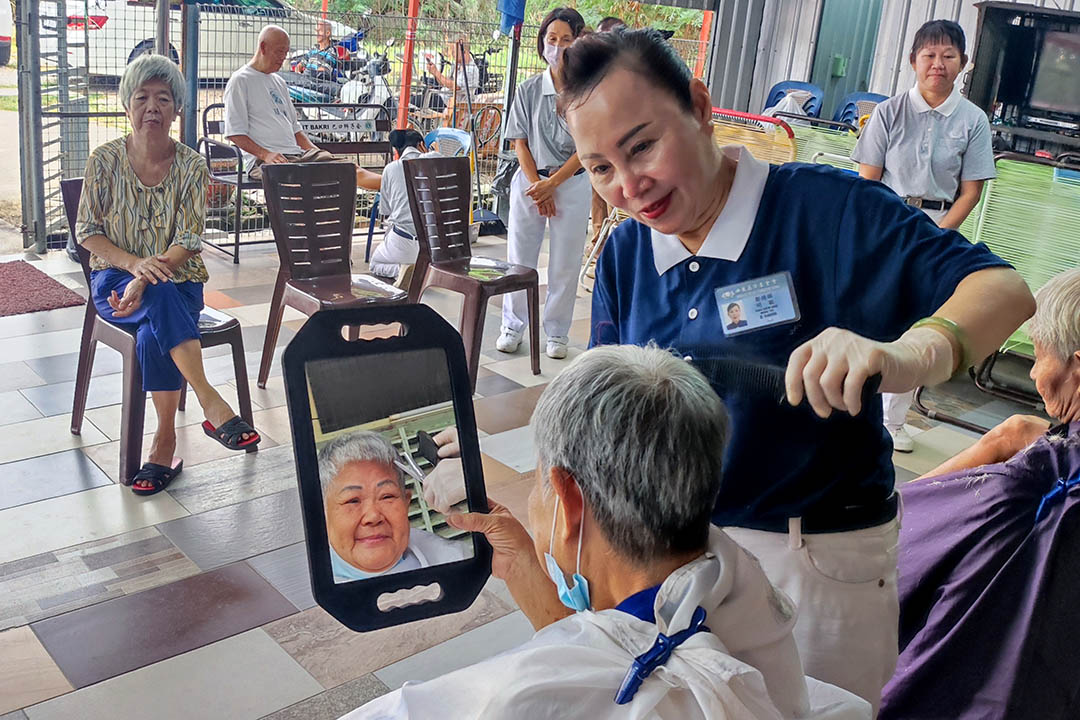 郑绣媖(右)用心为长者理发,长者拿镜子欣赏新造型,笑容满溢。【摄影:苏秀莲】