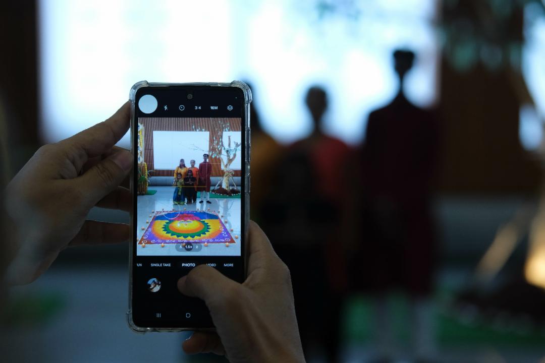 2025年10月12日,屠妖节现场洋溢着喜悦与欢笑,五彩缤纷的彩绘米图(Kolam)象征着欢迎与祝福,许多印裔家庭特地拍照留念。志工们更展现巧手与创意,细心为来宾绘上海娜(Henna)彩绘,让大家留下美丽的印记。