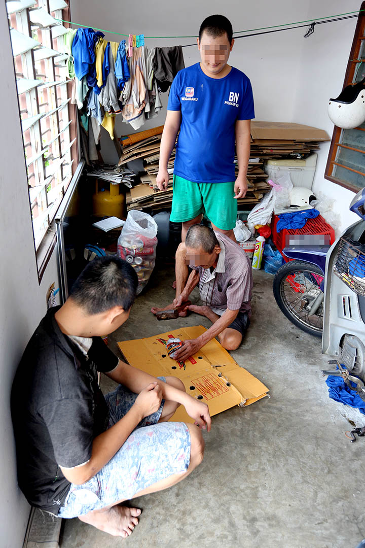 老金(中)从事拾荒赚取微薄收入,照顾两名成年的智障儿。慈济志工获悉2017年开始走入关怀与生活援助。【摄影:罗秀莲】