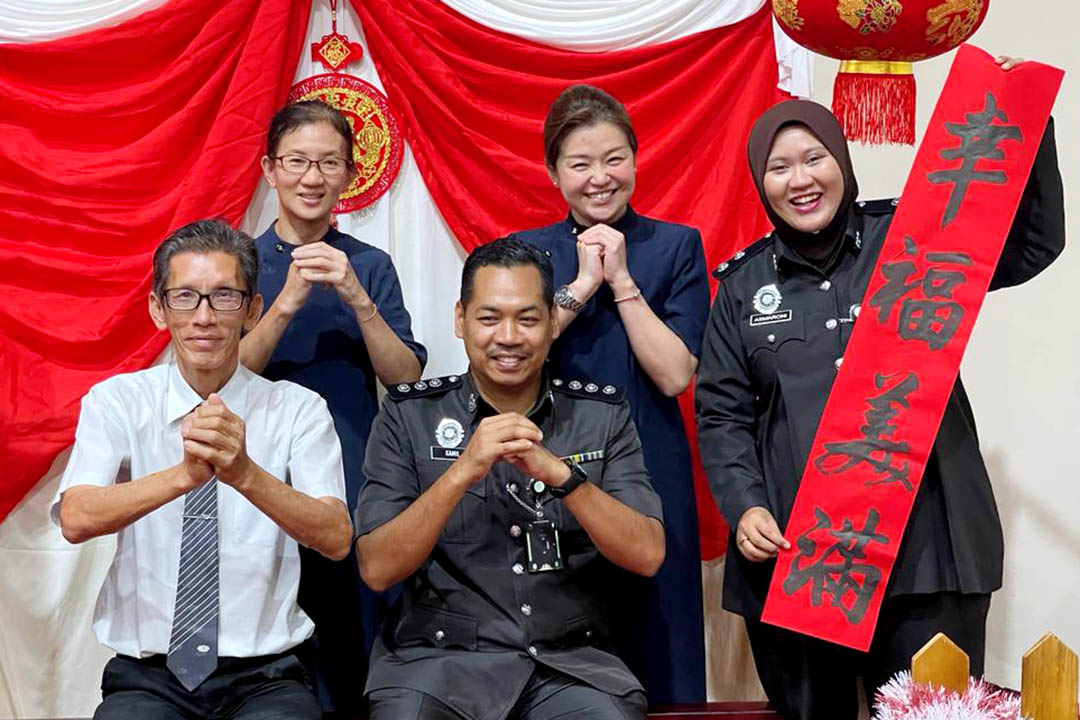 志工受邀参与马六甲双溪乌浪监狱为受刑人举办的新春团圆活动,开心地与官员合照留念。【照片:刘珌娟提供】