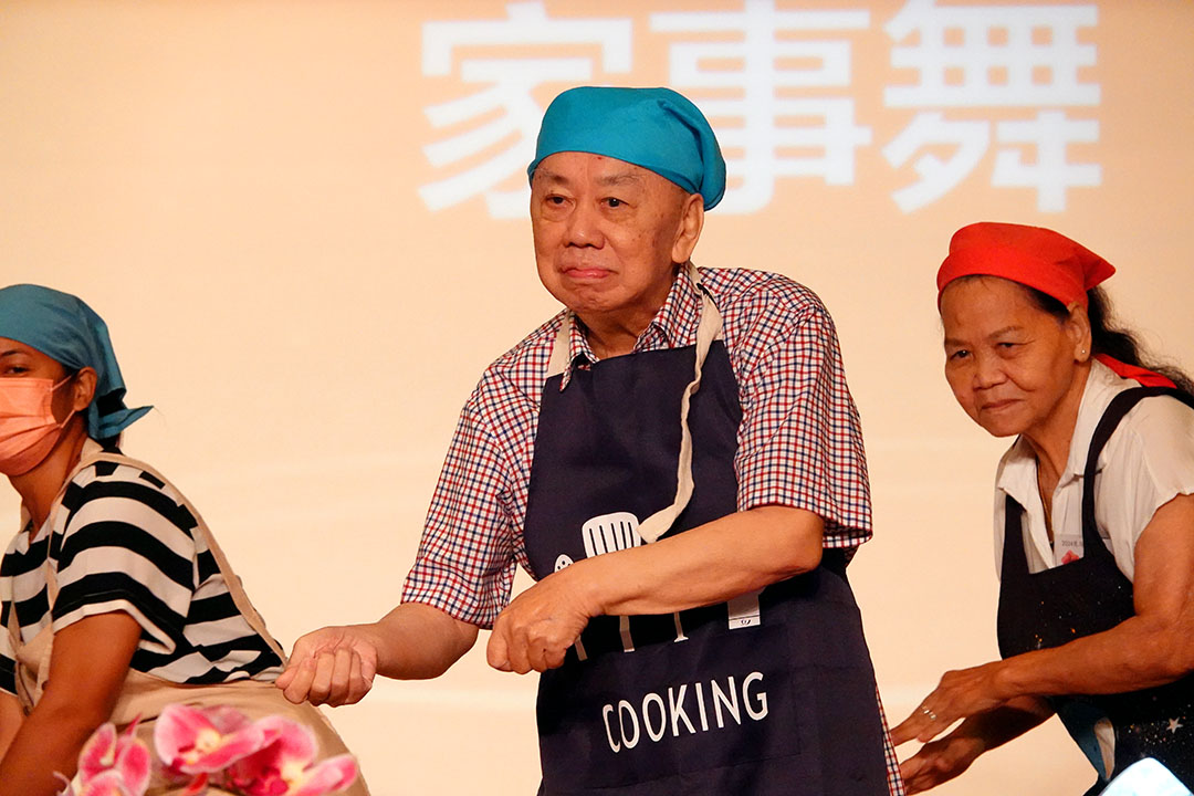 七十二岁的黄锦明举起手摇铃,当上台演出时,他自己逐步步上舞台,无需一旁的外籍看护协助。站在舞台上,随着热门舞曲,他笑开怀地舞动手脚跟着组员一起跳“家事舞”,热闹的音乐搭配年轻人的舞蹈动作,瞬间现场气氛沸腾。
