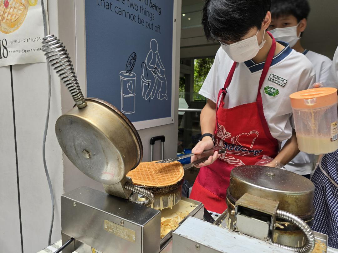 其中,韩式饭团与炒饭摊位的学生清晨三点便起床准备,只为在义卖会上尽一份力。 格子松饼摊位更是经历一段小插曲,家长借出的三台机器在义卖进行到一半时,其中两台突然故障,家长得知后连忙赶来维修。即便最后只剩下一台机器可以操作,孩子们仍坚持继续,把活动热度延续到最后一刻。