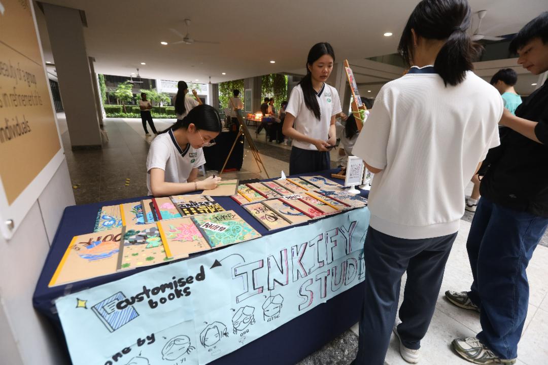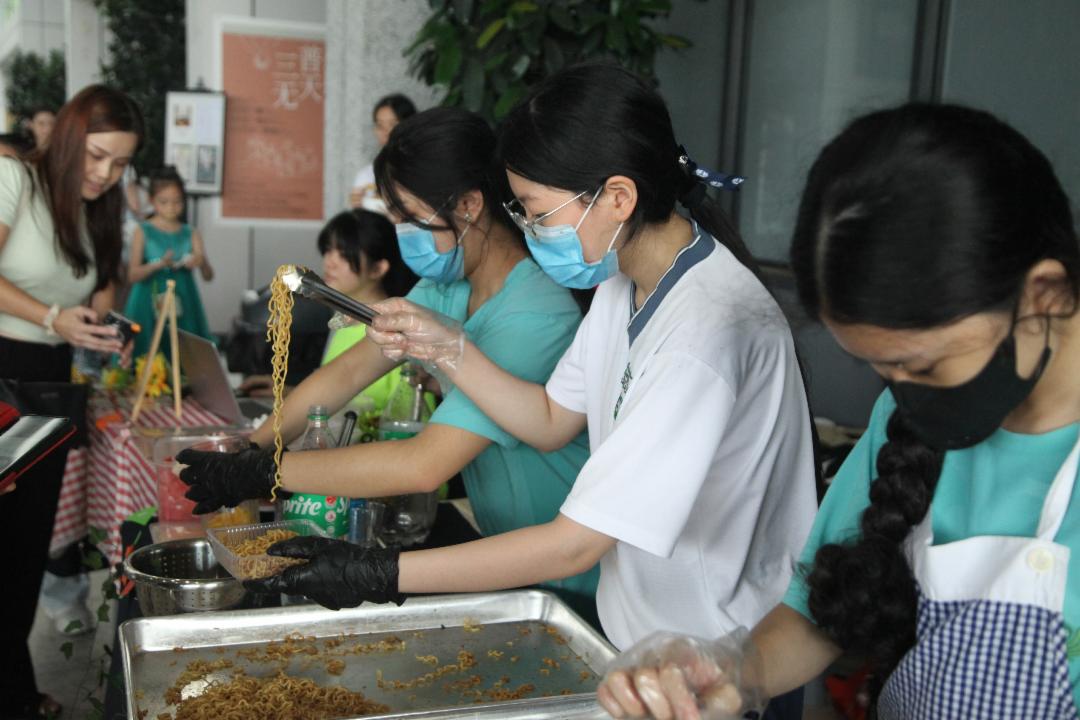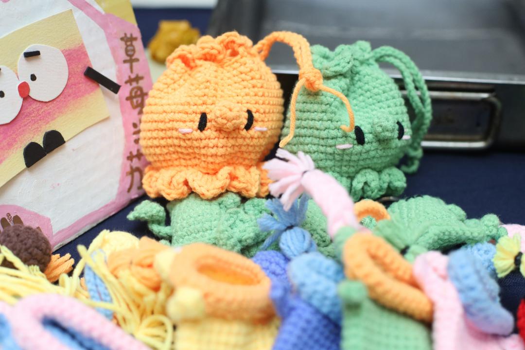摊位上琳琅满目的美食令人垂涎。甜点、小吃、饮料应有尽有,旣满足味蕾,也让人心情愉悦;热腾腾的正餐更为补充能量。 除了美食,中学生们也献上巧思,亲手编织小玩偶、钥匙圈、以及精美记事本封面彩绘,图案细腻、设计独特,吸引不少人驻足选购,成为最受欢迎的义卖商品。各摊位之间可见中学生努力的背影叫卖的、下单的、烹煮的、打包的,还有游走于义卖区与楼下烹饪教室的,大家都在为自己的岗位努力。