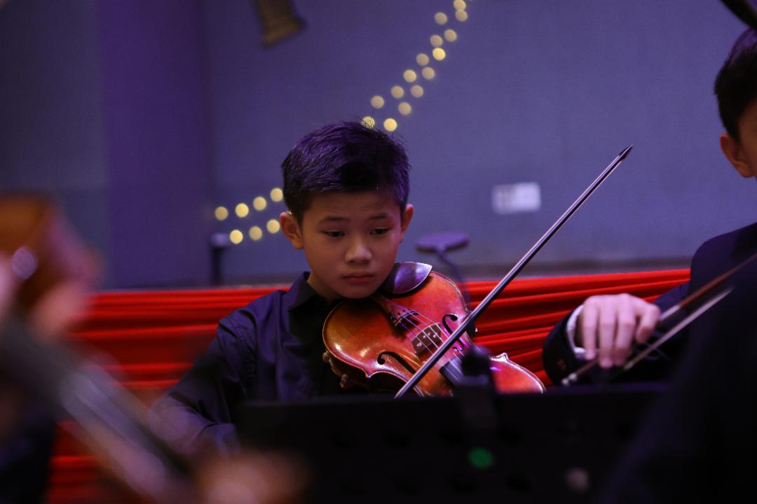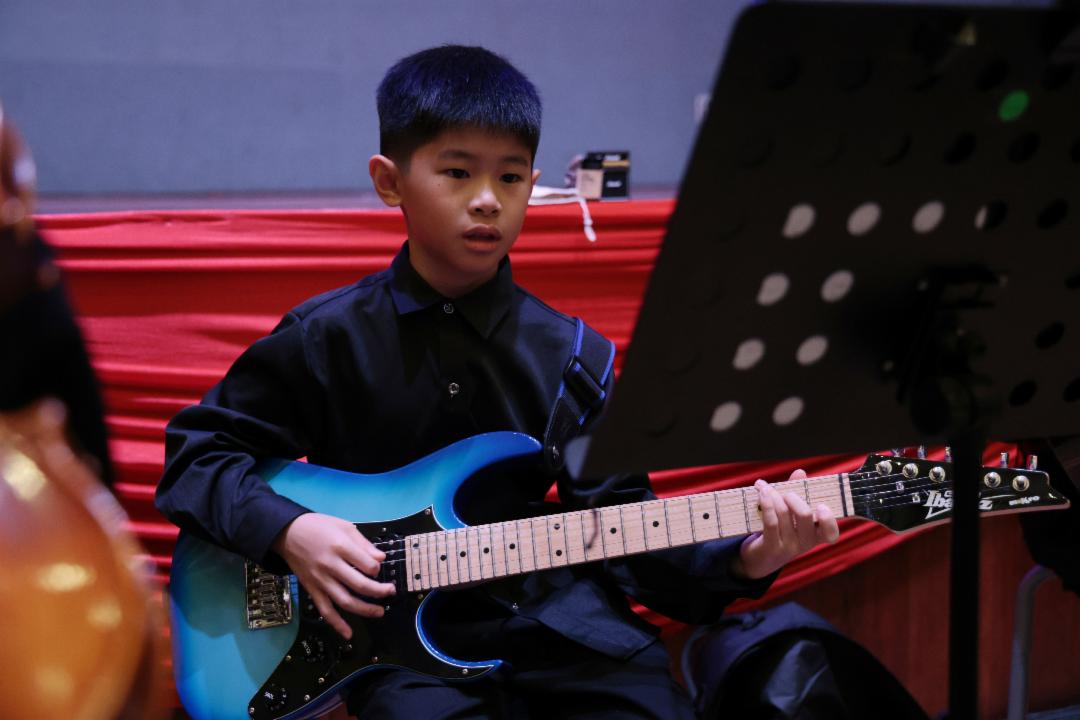 来自五年级感恩班的覃宥原在此次演奏中负责三种不同的乐器,包括电子吉他、鼓和钢琴。他强调团队合作的重要性,认为共同演奏能够创造更出色的音乐效果。