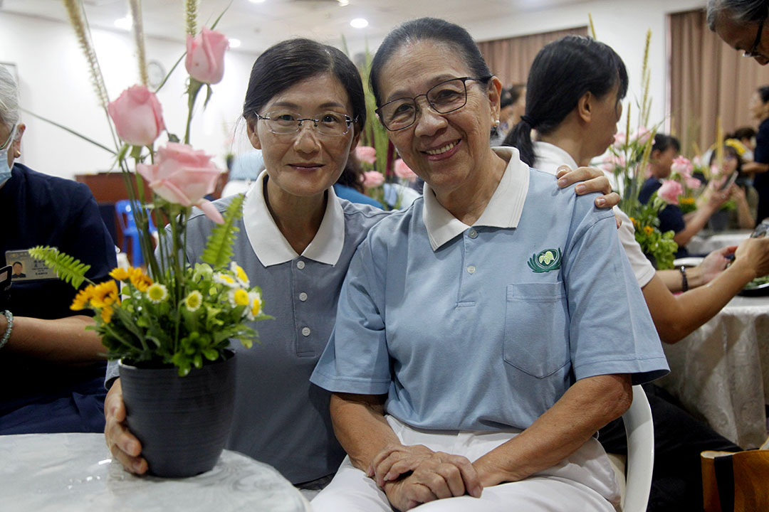 花道老师志工廖美华(右一)分享“爱洒人间”花道精神,展现教联会将生活美学融入生命教育的人文花道风采。【摄影:黄玉花】