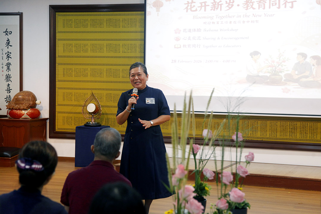 2026年2月28日教师新春联谊会上,今年承担教联会组长的黄雪霞老师向台下校长与教师介绍教联会,往事历历在目。曾是第一届成员的罗绣甄(慈瑞),如今从教职退休,承担慈济马六甲分会执行长;江新慧(慈蒂)老师退休后持续投入教育,目前带动慈济银发族的长者学堂,从年轻教到老。两人都曾担任马六甲教联会第二届与第三届组长,也曾历经组织一度停摆。如今重启活动,现场三十七位资深和新进的校长与教师齐聚,两人看见使命的传承与接力,在教育中持续播下爱与希望的种子。