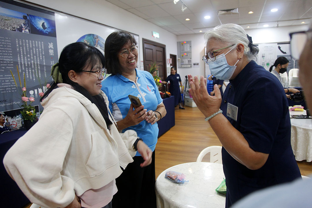 曾任教职的志工陈彩珠(右一),退休后全心投入志工行列;现场,与邓艾琳(中)、周玉玲(左一)热络分享与交流,气氛温馨。【摄影:黄玉花】