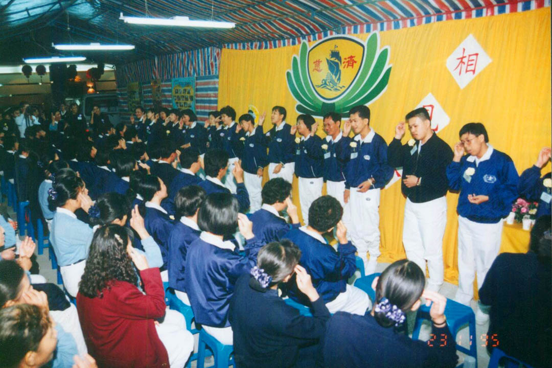 1995年,慈济马六甲首批三十多位教师飞往台湾参与营队,并上台呈现手语。【照片:慈济马六甲分会文史组提供】