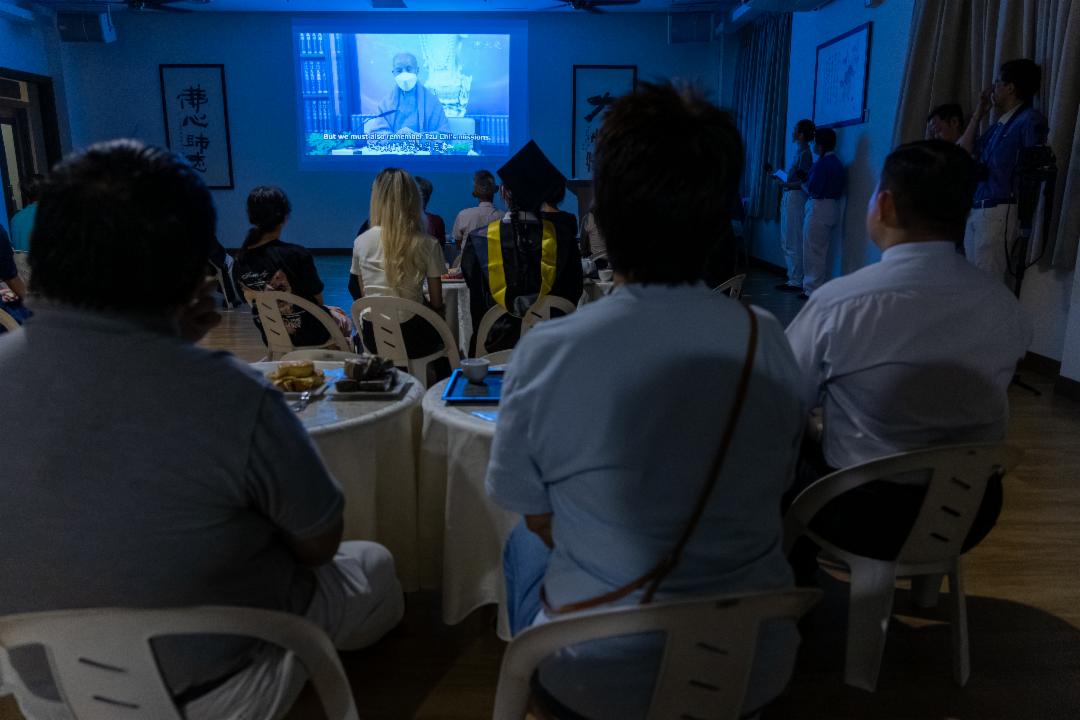 茶会最后播放师公证严上人的开示:父母给予我们宝贵的生命,作为子女,应当以一颗孝心珍惜自己的身体,行善造福,回馈社会,让生命发光发热,温暖他人。【摄影:叶恩汉】