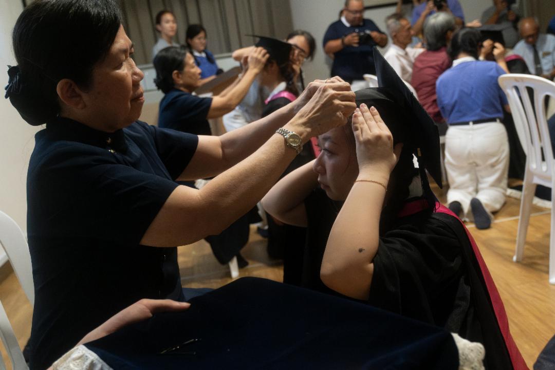 柔和乐音响起,父母亲为孩子戴上学士帽,轻轻将稻穗从右边拨到左边,象征着稻穗成熟、学有所成。那一刻,不只是大学学业的圆满,更是感恩的启程。
