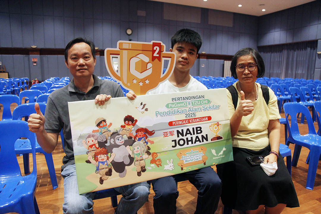 来自马六甲华文中学(SMJK Tinggi Cina Melaka)就读中四的潘智凯,全程以英文作答,凭着稳定的答题节奏与冷静思考,从全国的高手中脱颖而出,拿下中学组第二名的佳绩,获得奖金八百令吉,陪伴前来的家人和老师都为他感到骄傲。
