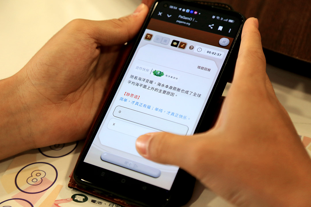 平时热爱电子游戏的她,当老师介绍这项“能边玩边学环保知识”的PaGamO线上比赛时,立刻举手报名。“一听到可以用游戏方式学东西,我就想试试看,并邀约同学一起参加。”一旁获得全国赛第四名的张宇婕开心地说:“就是她约我参加的,我没想到会晋级,更没想到今天会得奖。拿到奖金我要去买魔术方块,另一种动脑的游戏。”