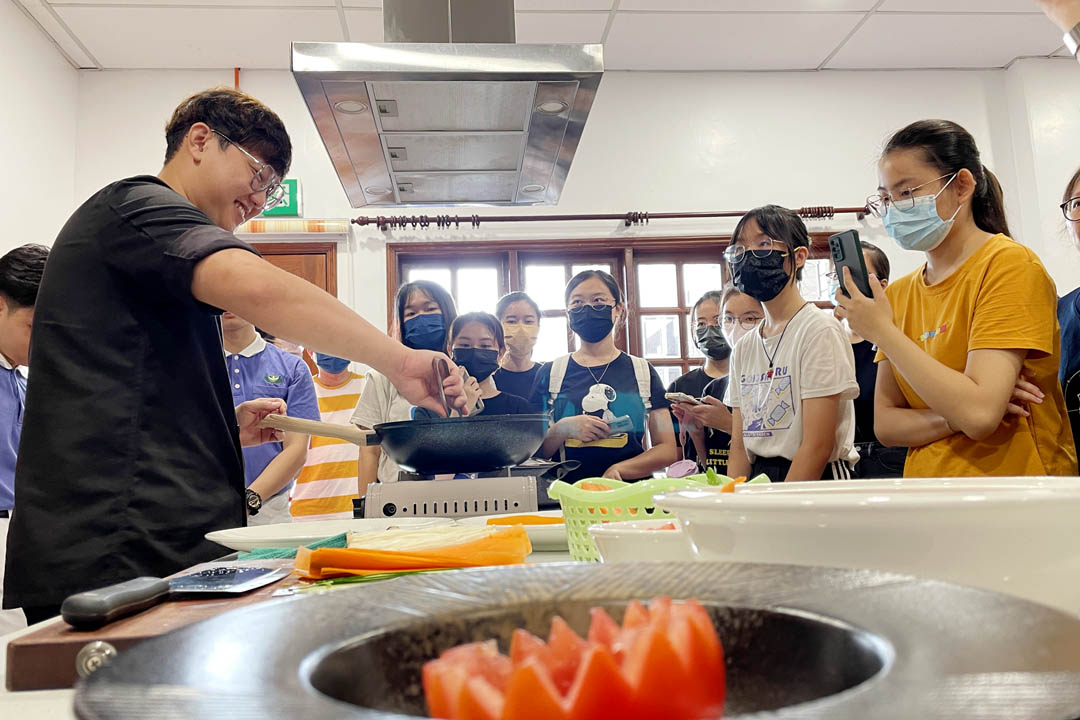 袁振富老师强调,此道菜烹煮手法简单,但颜色丰富,摆盘精致。色香味俱全的料理,“色”摆第一位,因为料理的颜色能勾起大家想吃的欲望,食材颜色的搭配与摆盘能为料理加分。教学过程中,大家非常专注留意老师的每个动作,有些参赛者拿出手机记录过程,深怕错过任何一个小细节。之后,各组人员复刻做出第一道竞赛料理。