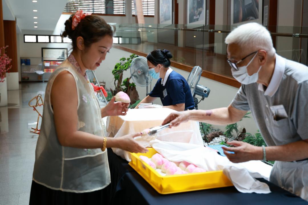 寿桃包寓意吉祥,志工温柔递上,让年味更添温暖。【摄影:邓亦绚】