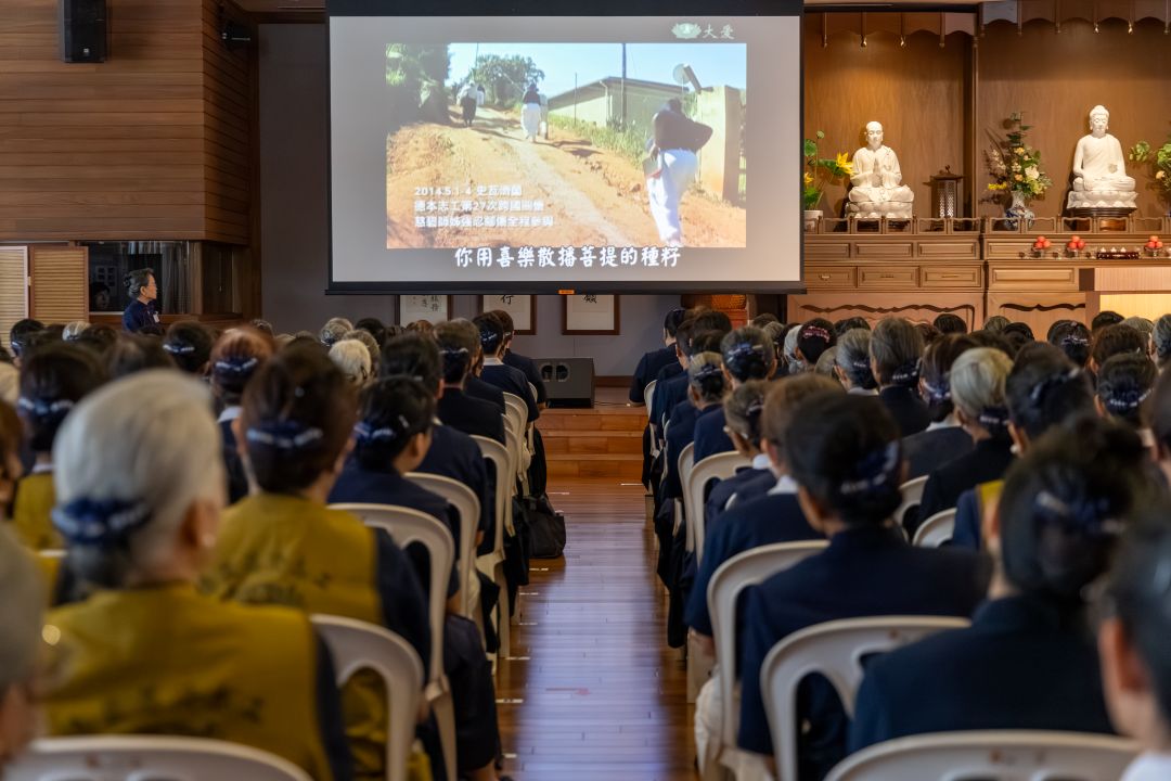 透过影像配合〈大地之母〉的歌词,志工在哼唱中,细细体会上人的慈悲喜舍之精神。【摄影:叶恩汉】