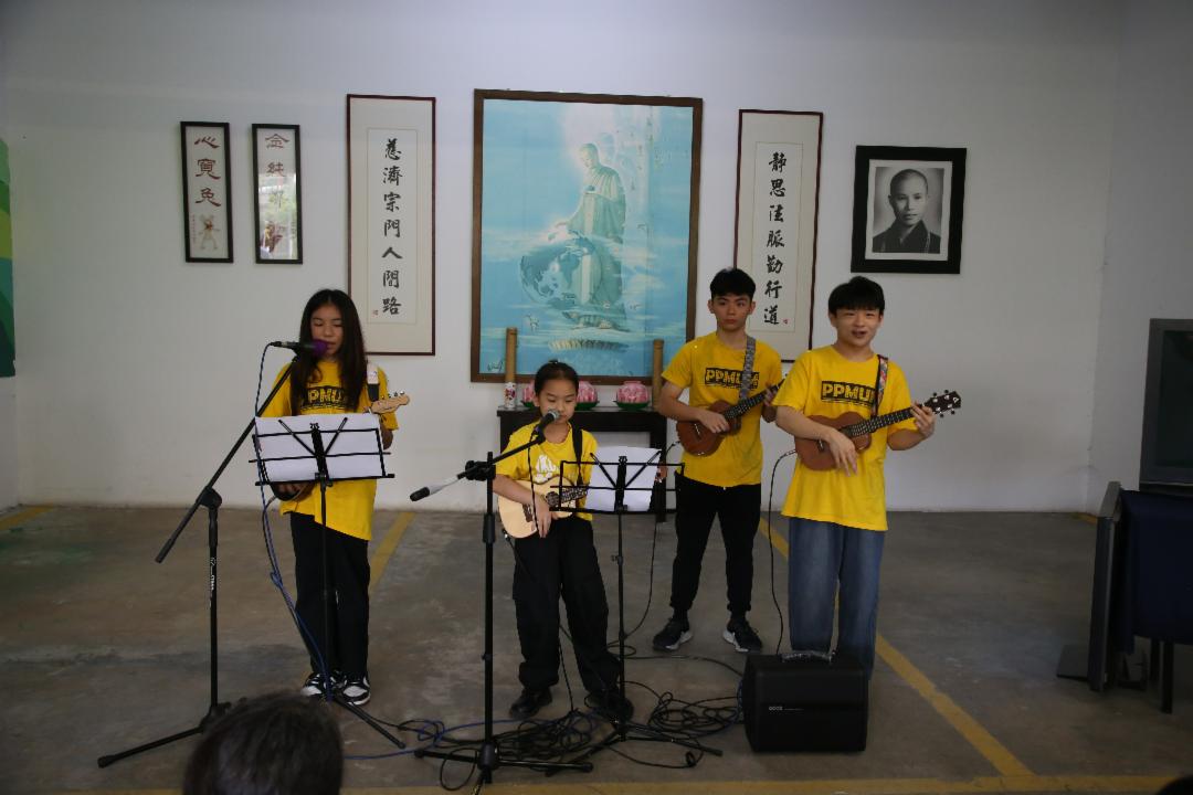 近午时,来自Wawa Studio 安亲补习班的小朋友带来手语〈地球的孩子〉,传递守护地球的慈悲心念;马来西亚尤克里里爱好者协会(PPMUM)的成员也献上轻快乐曲,让会场充满音乐与善念交织的欢喜气氛。