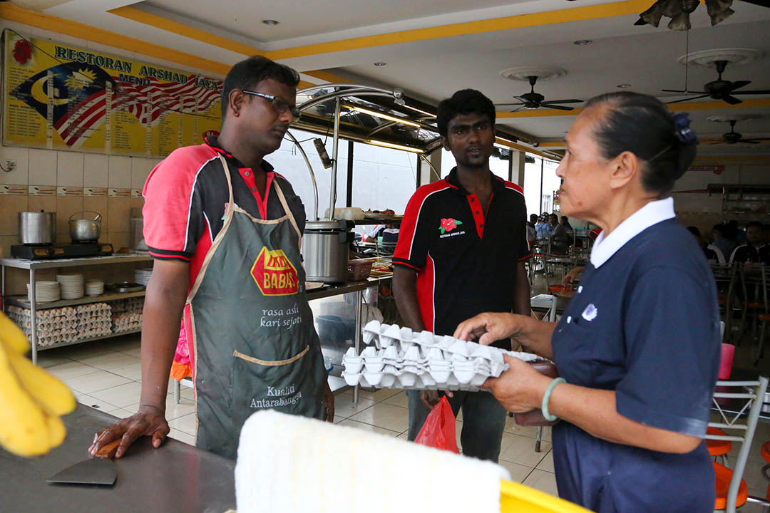 语言障碍并不影响曾敬媚做环保的心,她透过肢体语言和印度餐厅的员工沟通。抱持多一个人认识而愿意做环保,就多一分力量。【摄影:颜玉珠】