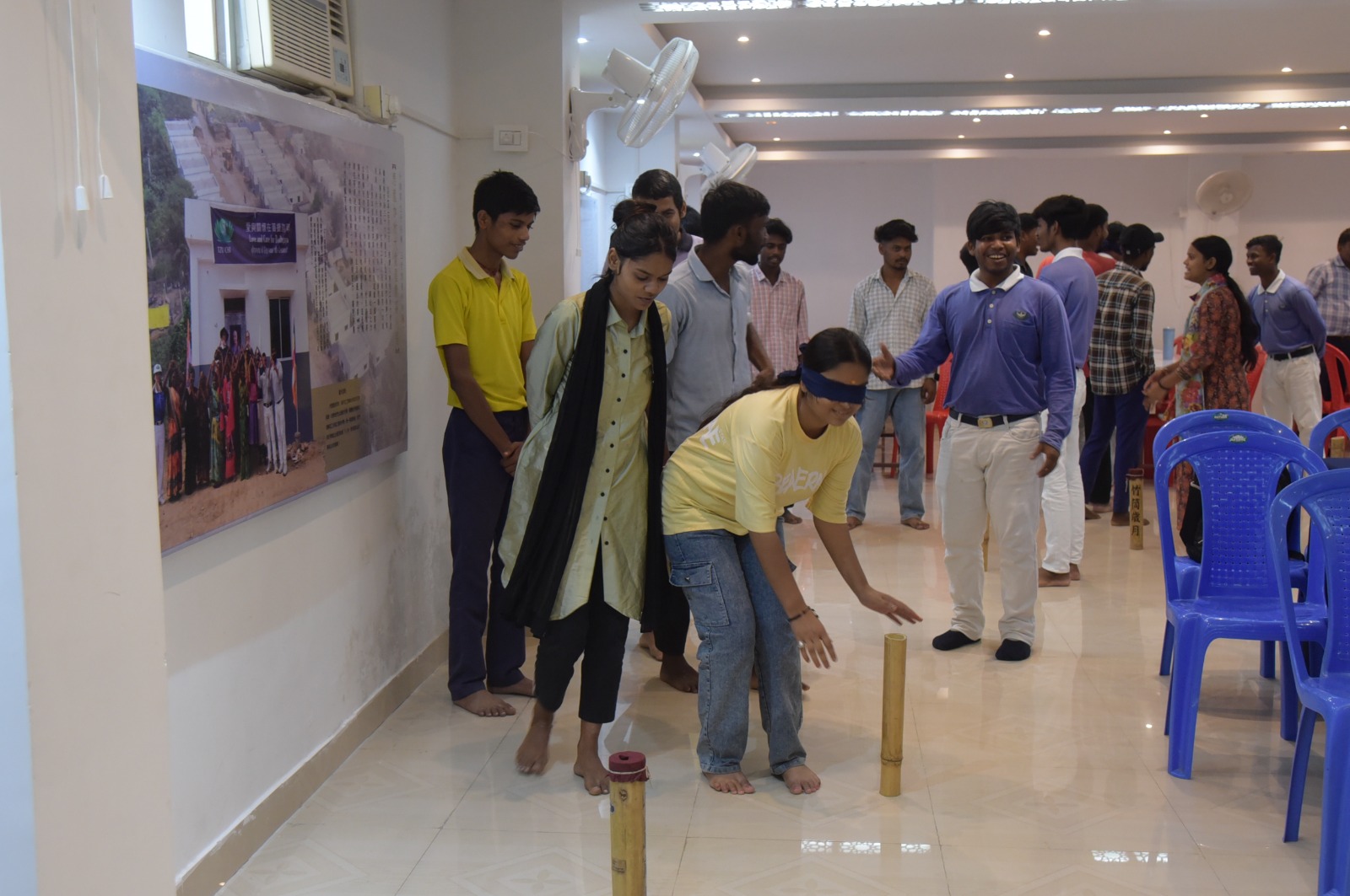 首先安排的是寻宝游戏,每一组派出一个代表,以黑布条蒙眼,在其它组员的陪伴及指示下,找寻摆放在场内的竹筒。“这是让他们领悟,只要有明师指引,就可以找到正确的目标。”