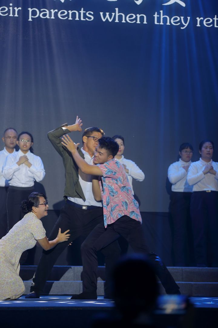 近百名素人演员在舞台上的每一个动作,都像在诉说家庭里的故事。从八旬奶奶、饮食业中壮年、教育工作者到全职妈妈,跨世代的演出者在舞台上诉说自己的孝亲故事,也向社会传递“及时行孝”的讯息。
