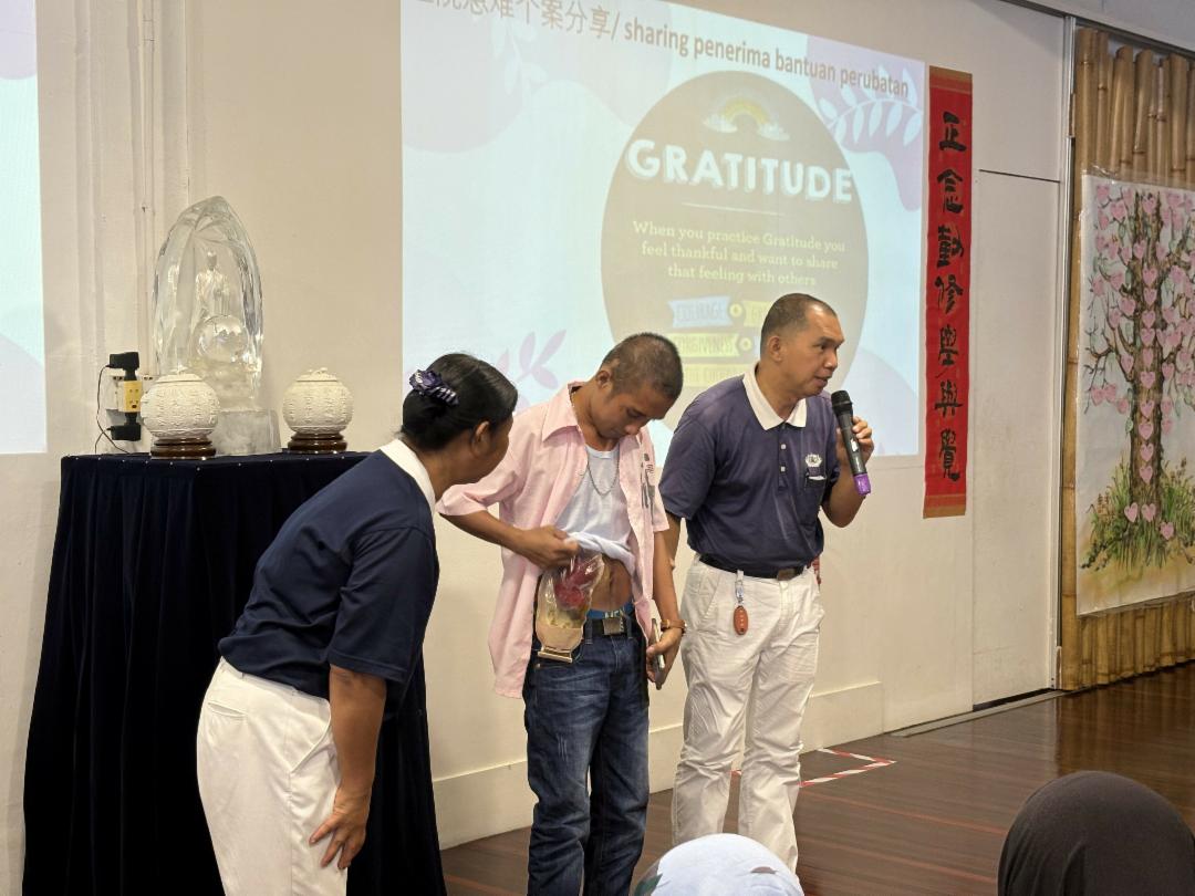村民沙立(Encik Sarip )来自十六哩贡贡甘榜的急性盲肠病患,因盲肠炎手术及装置人工肛门,曾瘦弱至不成人形。在慈济支援医疗费与静思产品的补助之下,健康逐渐恢复,当天带着妻子参与环保培训,感恩慈济给予“重获生命”的机会。